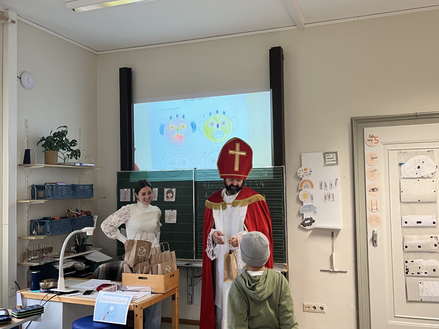 Der Elternbeirat hat die gesamte Organisation übernommen: Von der Abholung der Spende bei Kaufland bis hin zum kreativen Verpacken der Tüten. Die Kinder waren von dem Besuch des Nikolaus vollkommen überrascht. Mithilfe der Lehrerinnen und Lehrer, die die Kinder auf Gitarre bzw. Keyboard begleiteten, haben die Erst-, Zweit- und Drittklässler sowie die Klassen SFK 1/2 das Lied „Lasst uns froh und munter sein“ gesungen. Dies schuf eine festliche Atmosphäre, die die Kinder noch lange in Erinnerung behalten werden.